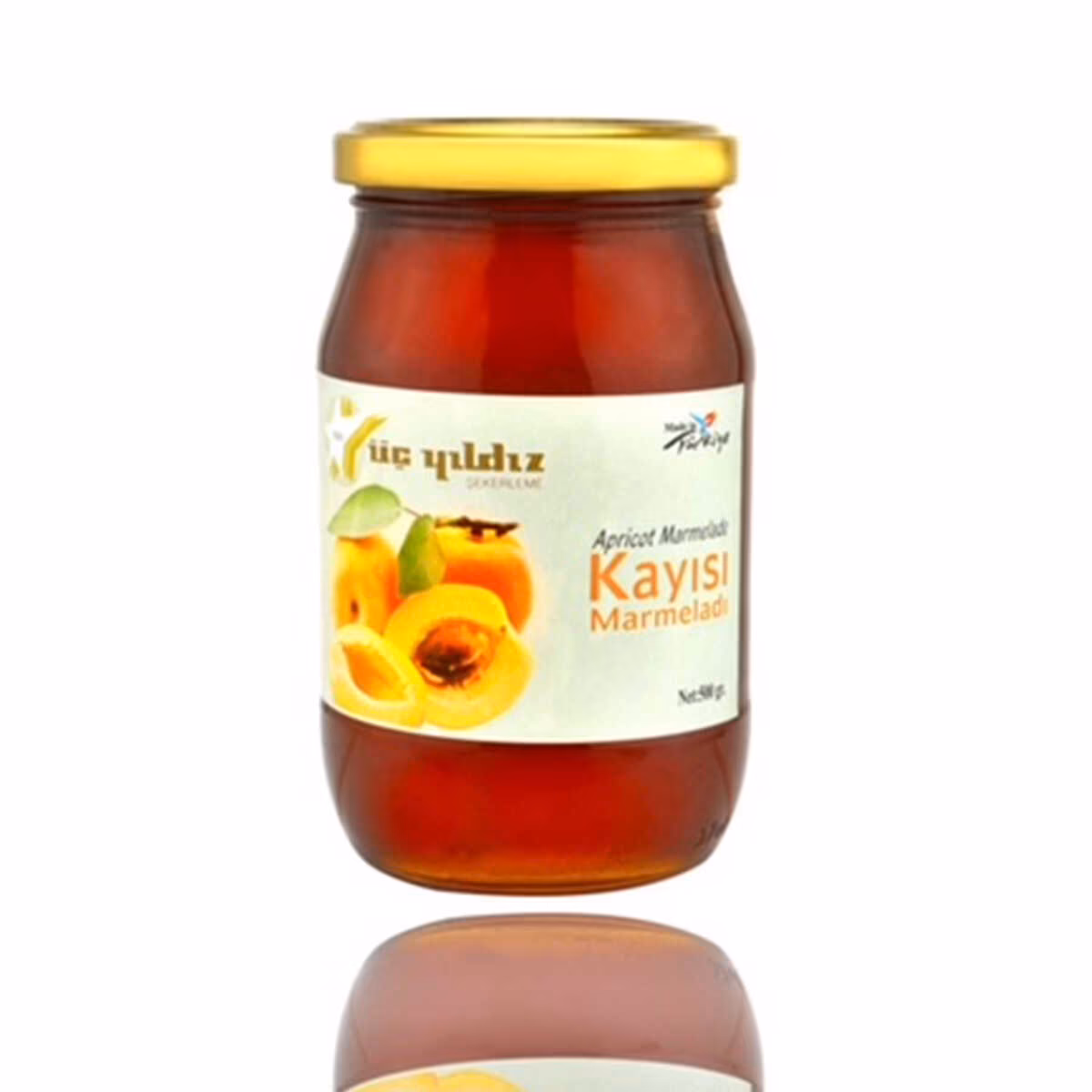 Üç Yıldız Şekerleme’nin doğal lezzetlerinden Kayısı Marmeladı, ev usulü yapılmıştır. İçeriğinde şeker, kayısı ve limon suyu bulunmaktadır. Kayısı kendi doğal tadı ve rengi ile kahvaltılarınızı zenginleştirecektir. Hiç bir boya, koruyucu madde ve katkı maddesi içermez.
